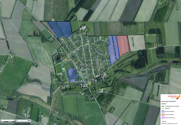 Kortet nedenfor viser udviklingsmulighederne i Isenvad i overensstemmelse med de strategiske mål om at udnytte eksisterende muligheder og udvide landsbyen arealmæssigt.