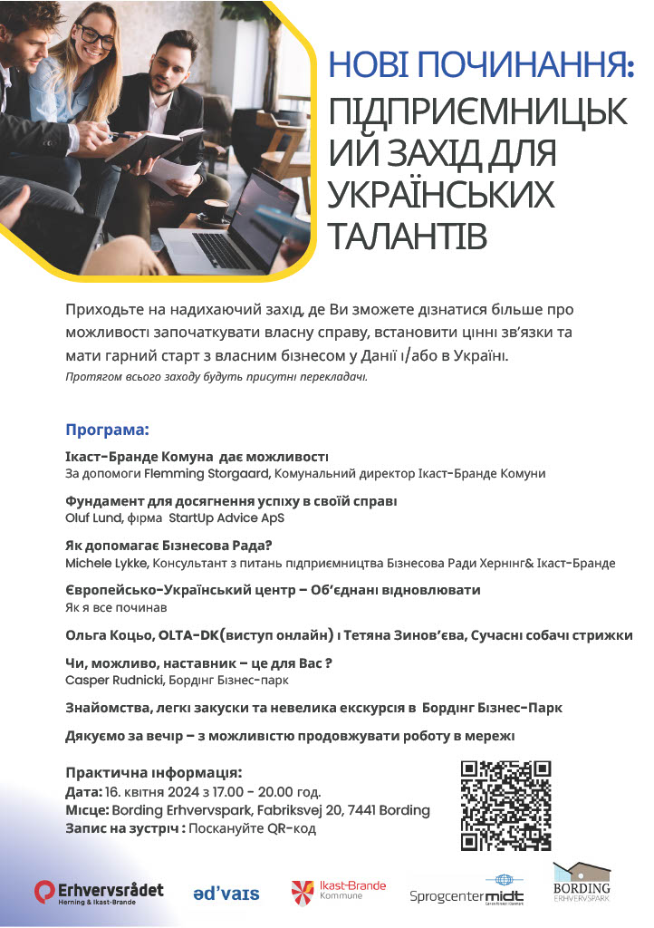 Den 16. april 2024 vil Bording Erhvervspark være vært for et særligt event, der henvender sig til ukrainske talenter, der drømmer om at starte deres egen virksomhed i Danmark eller muligvis fortsætte deres iværksætterrejse i Ukraine.