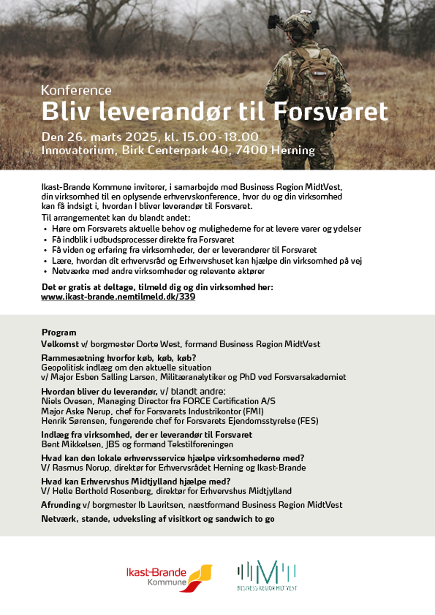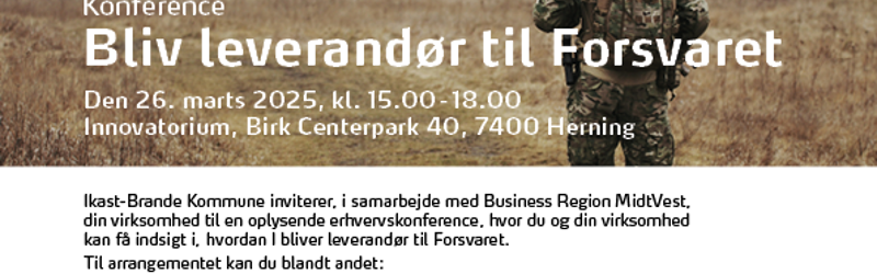 Derfor inviterer Ikast-Brande Kommune, i samarbejde med Business Region MidtVest, virksomheder til en oplysende erhvervskonference om at blive leverandør til Forsvaret.