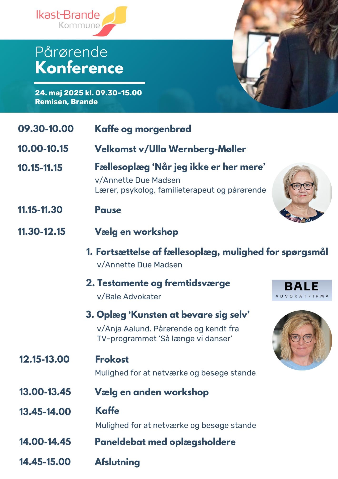 Ikast-Brande Kommunes Socialafdeling inviterer pårørende til Pårørende Konference 24. maj 2025. Vi får besøg af tre dygtige oplægsholdere, der vil dele ud af deres viden og erfaringer omkring det, at være pårørende. Hertil inviteres du til en interaktiv workshop, med mulighed for at møde afdelinger og medarbejdere i hele Socialafdelingen.