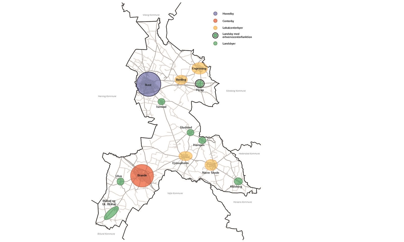 I Ikast-Brande Kommune er der fastlagt en by- og centerstruktur med et bymønster for hele kommunen. Bymønsteret viser byernes rollefordeling. Byerne er inddelt i et hierarki, som er baseret på byernes størrelser, funktioner og forudsætninger samt den rolle, de skal udfylde til gavn for den samlede kommune.