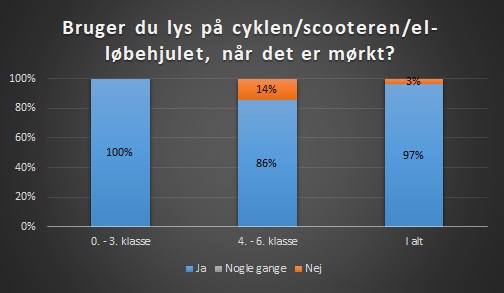 I 0. - 3. klasse har alle eleverne svaret, at de bruger lys på cyklen, når det er mørkt. I 4. - 6. klasse har 86% af eleverne svaret, at de bruger lys på cyklen, når det er mørkt.
