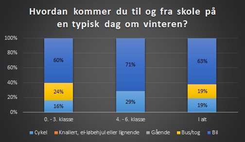 I 0. - 3. klasse svarede 16% af eleverne, at de cykler til og fra skole om vinteren, 24% kører med bus/tog og 60% bliver kørt i bil.