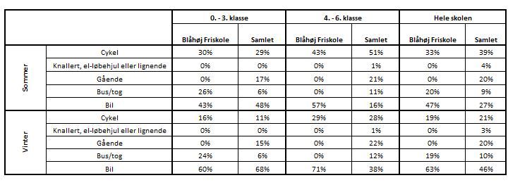 I 0. - 3. klasse cykler lidt flere end gennemsnittet om vinteren, mens de om sommeren ligger tæt på gennemsnittet. For 4. - 6. klasse cykler nogen færre end gennemsnittet om sommeren, og om vinteren ligger det tæt på gennemsnittet. Ingen på Blåhøj Friskole benytter scooter, el-løbehjul eller går til og fra skole. Bus/Tog benyttes af væsentlig flere end gennemsnittet i 0. - 3. klasse, i mens 4. - 6. klasse slet ikke benytter sig af bus og tog. De elever der bliver kørt i bil til og fra skole, ligger i 0. - 3. klasse noget lavere, end gennemsnittet for hele kommunen, hvor de i 4. - 6. klasse ligger væsentlig højere end gennemsnittet for hele kommune.