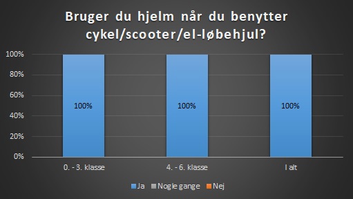 Alle elever i både 0. - 3. klasse og 4. - 6. klasse har svaret, at de bruger hjelm, når de cykler.