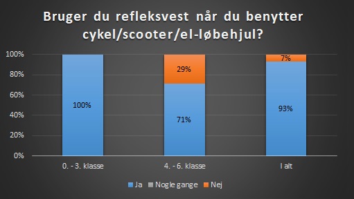 I 0. - 3. klasse har alle eleverne svaret, at de bruger refleksvest, når de cykler. I 4. - 6. klasse er det 71% af eleverne, der har svaret, at de bruger refleksvest.