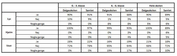 Eleverne på Dalgasskolen har svaret på en række spørgsmål om deres brug af lys, hjelm og refleksvest. Disse besvarelser kan ses i figurerne herunder, hvor de ligeledes er sammenholdt med besvarelserne for hele kommunen.