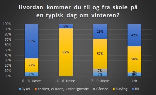 I 7. - 9. klasse har 7% af eleverne svaret, at de cykler til og fra skole om vinteren, 7% går, 57% kører med bus/tog og 29% bliver kørt i bil.
