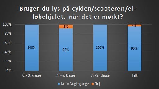 Samlet set har 96% af eleverne på Friskolen i Thorlund svaret, at de bruger lys på cyklen/scooteren/el-løbehjulet, når det er mørkt.