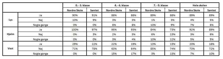 I tabellen herunder er brugen af sikkerhedsudstyr for elever på Ikast Nordre Skole opsummeret og sammenlignet med hele kommunen.