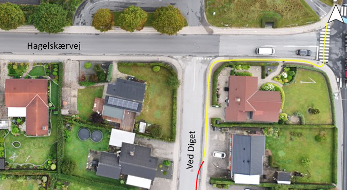 Der er otte elever, der kommer cyklende nordpå ad Ved Diget, hvorefter de står af cyklen og begynder at trække cyklen af fortovet mod lyskrydset, jf. figur 4. De indgår således ikke på ovenstående figur, da de er registreret som fodgængere i kortudsnittet. Adfærden kan skyldes, at cyklisterne er utrygge ved at cykle på/krydse Hagelskærvej, hvilket kan skyldes vejens bredde, trafikmængde eller hastighed.