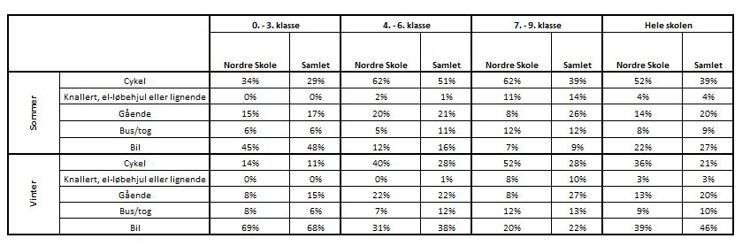 I ovenstående tabel ses det, at der i alle klassetrin er betydelig flere elever der cykler til og fra skole, både om sommeren og om vinteren på Nordre Skole, i forhold til gennemsnittet for hele kommunen. Den andel der transportere sig på scooter eller el-løbehjul, ligger tæt på gennemsnittet for hele kommunen. For 0. - 3. klasse og 7. - 9. klasse kan vi se, at nogen færre, specielt i de ældste årgange vælger at gå, mens der i 4. - 6. klasse er ca. ligeså mange som gennemsnittet for hele kommunen der går til og fra skole. I 0. - 3. klasse og 7. - 9. klasse, tager tæt på gennemsnittet for hele kommunen bus/tog eller bliver kørt i bil til og fra skole, imens 4. - 6. klasse tager bus/tog eller bliver kørt i bil, noget mindre end gennemsnittet.