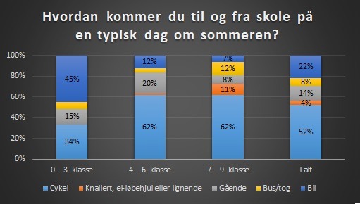 I 7. - 9. klasse har 62% af eleverne svaret, at de cykler til og fra skole om sommeren, 11% kører scooter eller el-løbehjul, 8% går, 12% kører med bus/tog og 7% bliver kørt i bil.