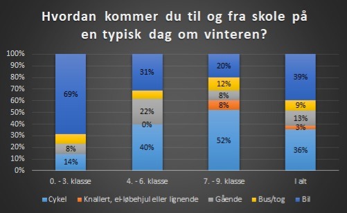 I 0. - 3. klasse har 14% af eleverne svaret, at de cykler til og fra skole om vinteren, 8% går, 9% kører med bus/tog og 69% bliver kørt i bil.