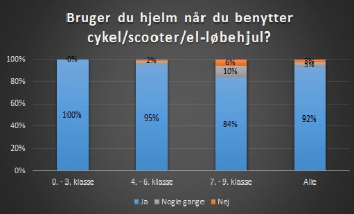 I 0. - 3. klasse har alle eleverne svaret, at de bruger cykelhjelm. I 4. - 6. klasse er det 95%, og i 7. - 9. klasse er det 84% af eleverne, der har svaret, at de bruger hjelm.