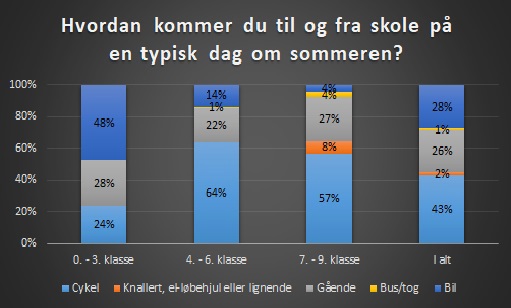 I 7. - 9. klasse har 57% af eleverne svaret, at de cykler til og fra skole om sommeren, 8% kører scooter eller el-løbehjul, 27% går, 4% kører med bus/tog og 4% bliver kørt i bil.