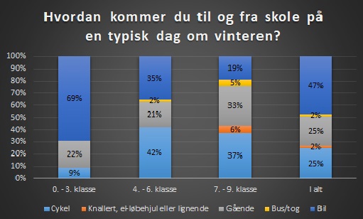 I 7. - 9. klasse har 37% af eleverne svaret, at de cykler til og fra skole om vinteren, 6% kører scooter eller el-løbehjul, 33% går, 5% kører med bus/tog og 19% bliver kørt i bil.