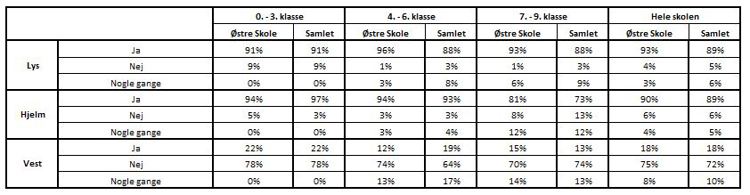 I ovenstående tabel ses det, at andelen af elever, i 0. - 3. klasse, der bruger lys på cyklen, når det er mørkt, er det samme som gennemsnittet, imens eleverne i 4. - 6. klasse og 7. - 9. klasse ligger noget højere end gennemsnittet.
