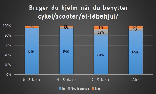 I 0. - 3. klasse har 94% af eleverne svaret, at de bruger hjelm, når de kører på cykel. I 4. - 6. klasse er det 94% og i 7. - 9. klasse er det 81% af eleverne, der har svaret, at de bruger hjelm.