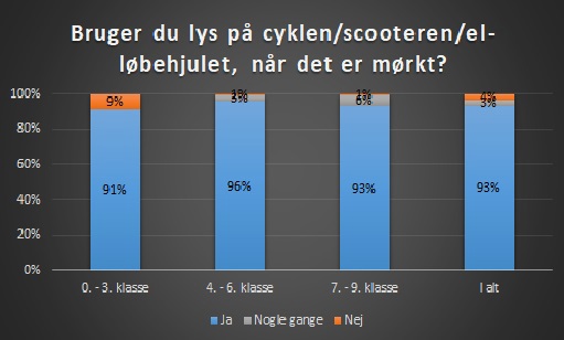 I 0. - 3. klasse har 91% af eleverne svaret, at de bruger lys på cyklen, når det er mørkt. I 4. - 6. klasse er det 96%, og i 7. - 9. klasse er det 93%, der har svaret, at de bruger lys på cyklen/scooteren/el-løbehjulet, når det er mørkt.