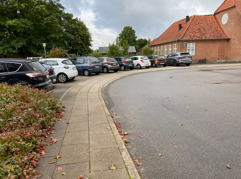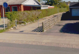 Parkeringsbåsene er placeret op mod hegnet til børnehaven med fortov bag ved de parkerede biler. Det skaber farlige situationer mellem fodgængere og bakkende biler. | Fortovet flyttes om foran parkeringsbåsene |
